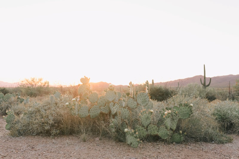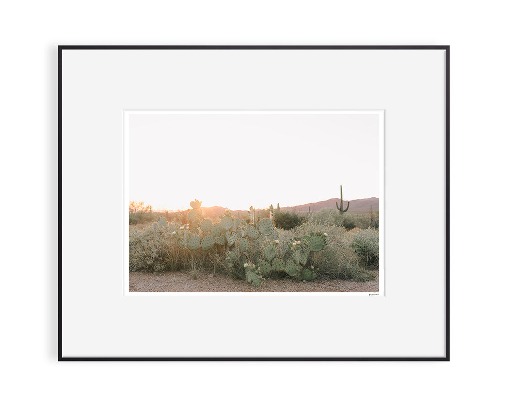 A dreamy desert landscape print taken in Saguaro National Park in Tucson, Arizona, at sunset.