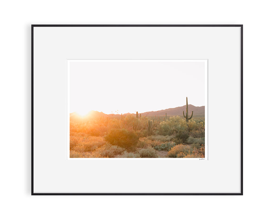 A desert landscape print taken in Saguaro National Park in Tucson, Arizona, at sunset.