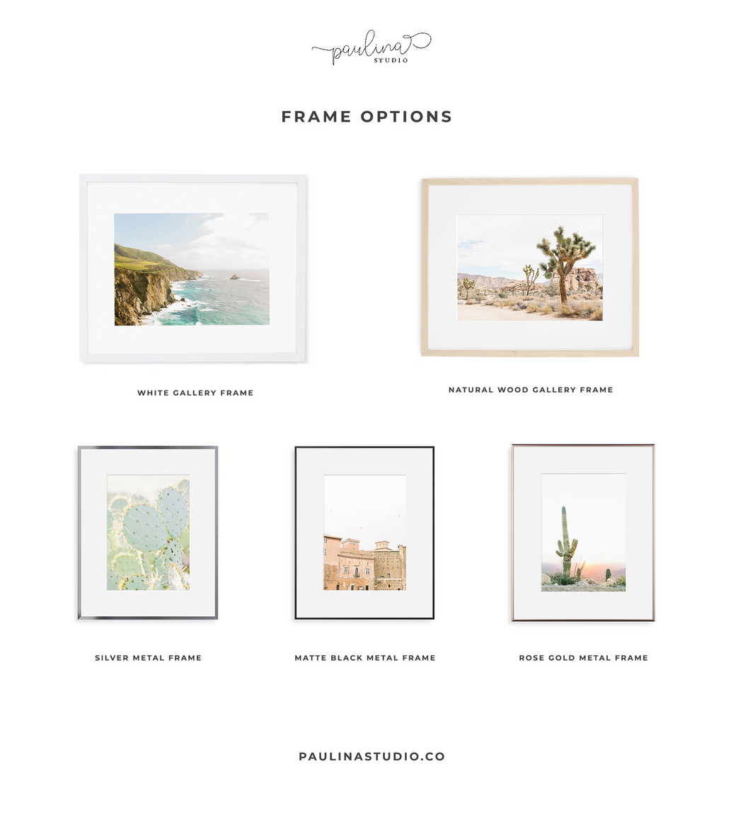 Add a custom frame to your print order and your print will arrive framed and ready to hang! Decorate your space with your choice of a white gallery frame, a natural wooden frame, or a silver, matte black, or rose gold metal frame! Frame must be ordered with print at time of purchase.