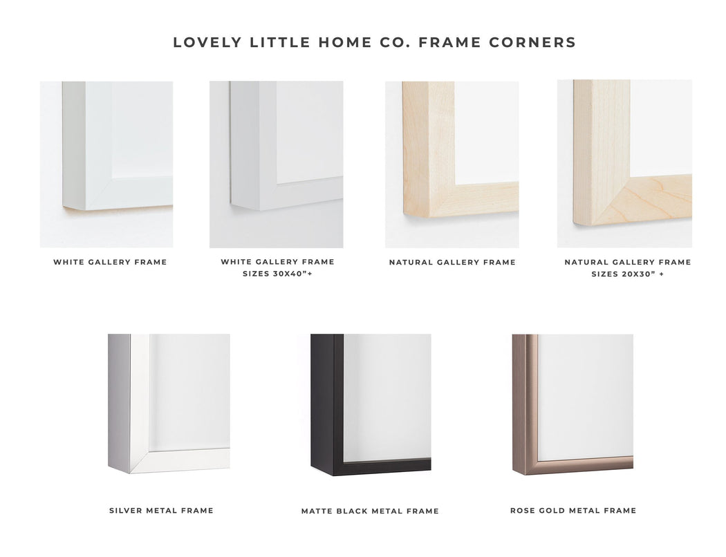 Looking for a frame for your new print? Add a frame to your print order! Decorate your space with your choice of a white gallery frame, a natural wooden frame, or a silver, matte black, or rose gold metal frame! All frames arrive with the art already framed and ready to hang! Frame must be ordered with a lovely little home co. print at time of purchase.