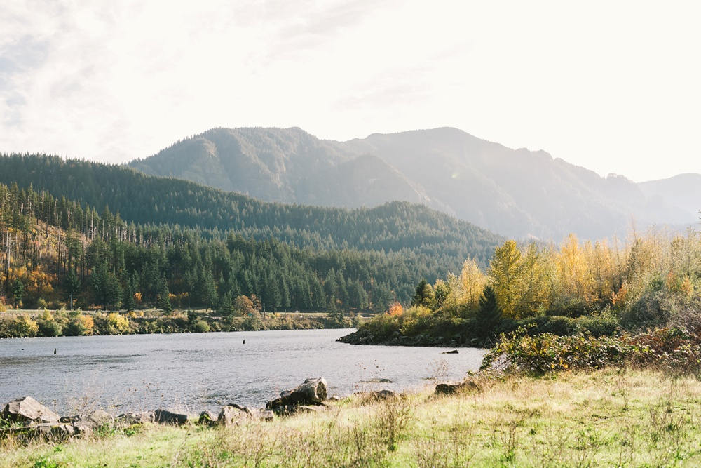 A fine art print near Portland, Oregon of the mountains, trees and leaves changing during the Fall season.