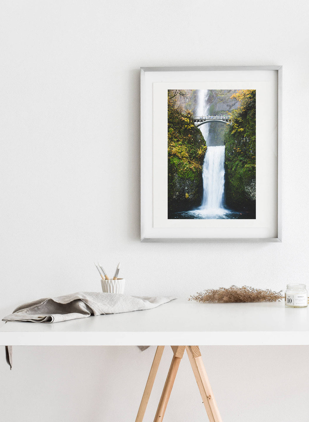 A fine art print of Multnomah Falls near Portland, Oregon, and the mountains, trees and leaves changing during the Fall season.