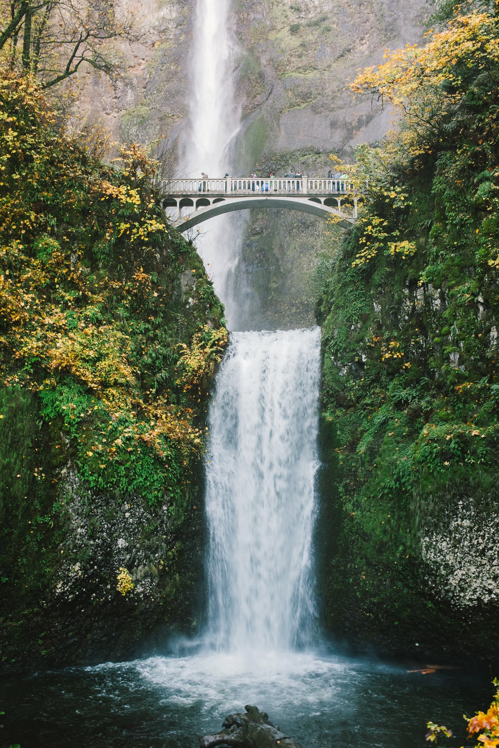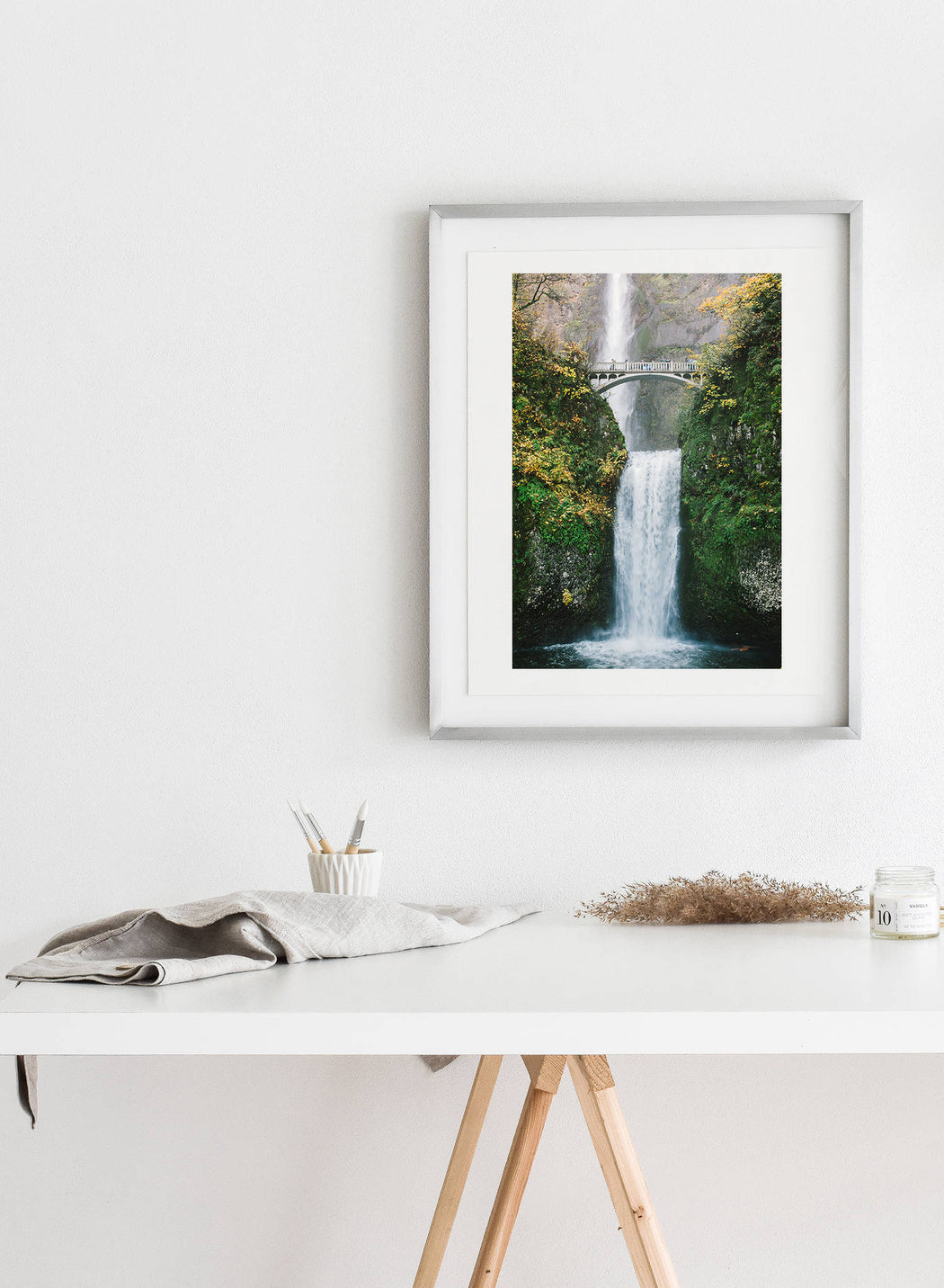 A fine art print of Multnomah Falls near Portland, Oregon, and the mountains, trees and leaves changing during the Fall season.