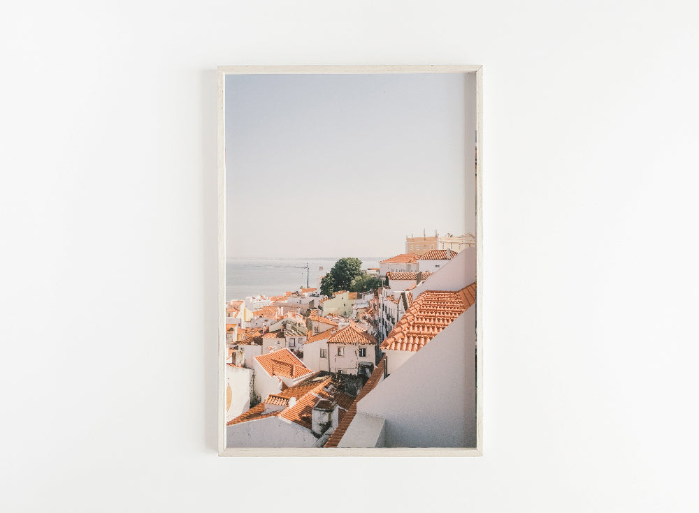 Enjoy the view of Lisbon's iconic red rooftops with this colorful Portugal travel print! This fine art print is the perfect piece of wall art to make your house feel like home.