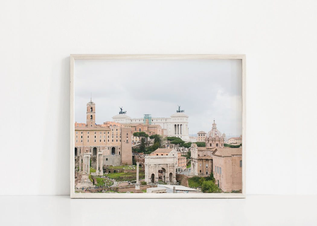 This fine art print showcases the beauty of the view from the Roman Forum and Palatine Hill in Rome, Italy.