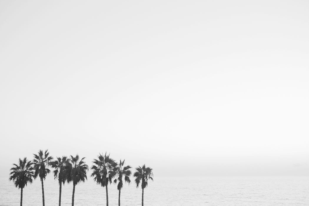 This black and white print features palm trees along beach in San Clemente, California at sunset.