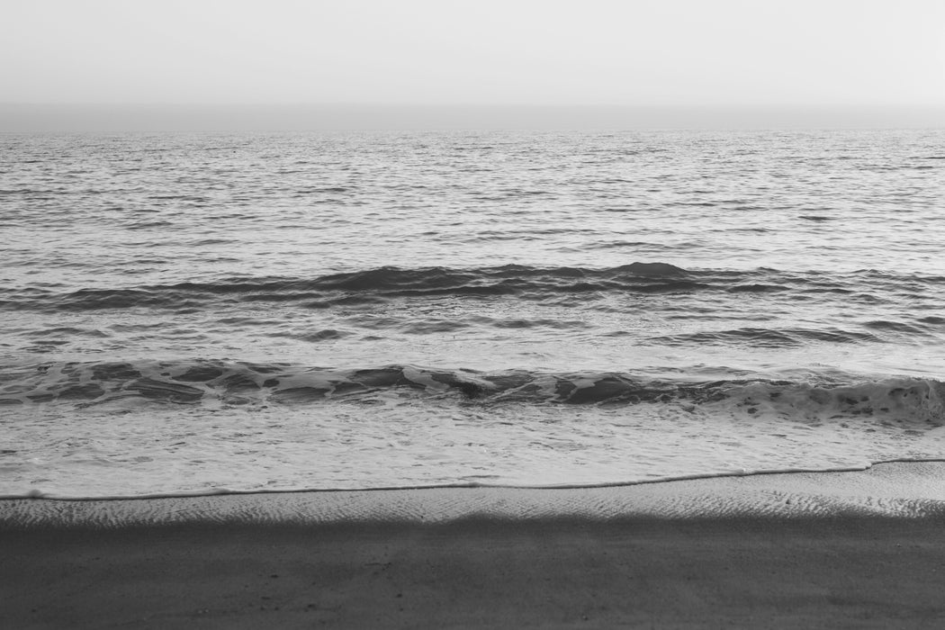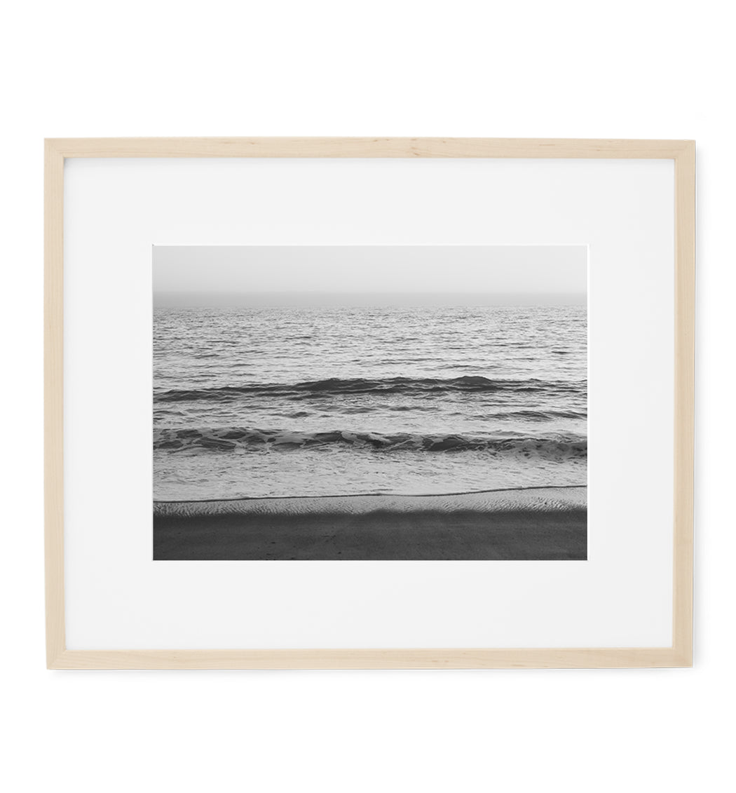 This black and white print features waves at the beach in San Clemente, California at sunset.
